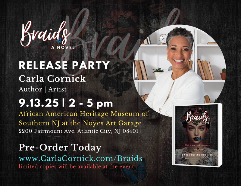 Join us for an exciting book release party for exhibiting artist Carla Cornick. Her book, Braids, is a sweeping literary novel told through nine self-contained stories and poems, woven together across continents and centuries. Though the characters never meet, their lives echo one another-each chapter a strand in a greater whole. From ancient Egypt to modern-day New Jersey, Braids is a meditation on love, loss, and the invisible thread that binds us through time. Limited copies will be available at the event. Pre-order the book at carlacornick.com/braids